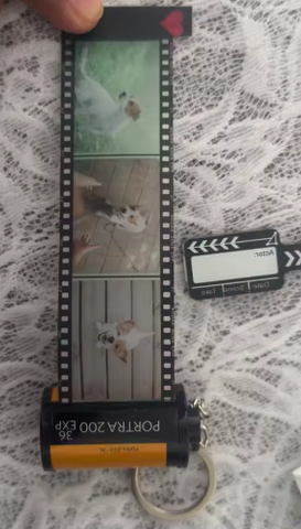 La tira de imágenes está fabricada en un material plástico flexible y duradero (PET), muy similar al celuloide real pero reforzado. Está diseñado para que puedas jalarlo y guardarlo repetidamente sin que se rompa o se desgaste la impresión de tus mascotas.